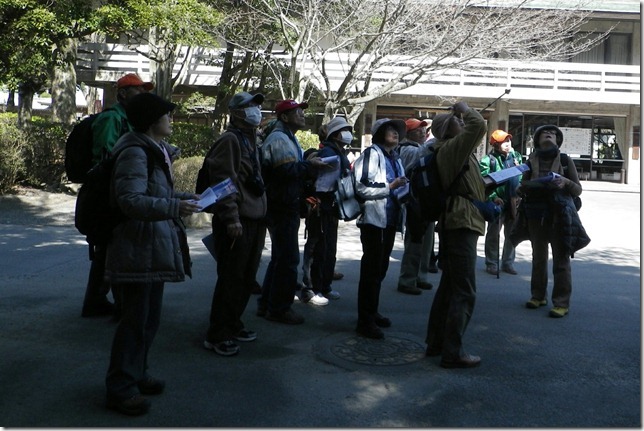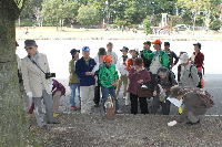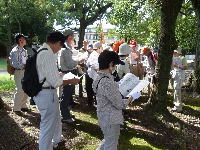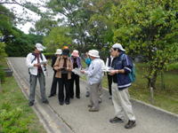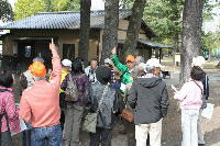 社務所前ではオガタマノキの花、裏山では珍しいカンザブロウノキの稚樹、キンモクセイとギンモクセイの葉の違い、クスノキの枯れ枝の香りなどを観察し、武道館前の神池の辺りで12時になり、昼食となりました。